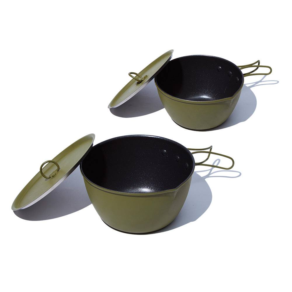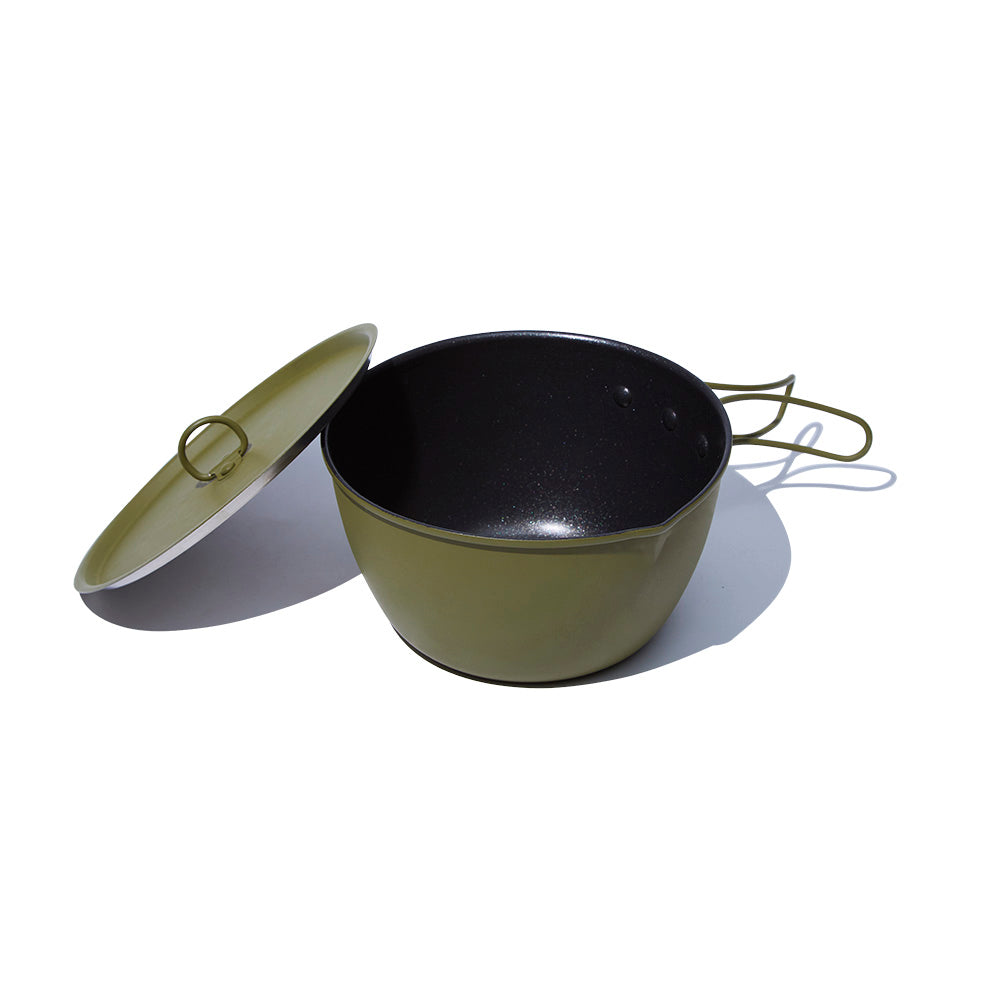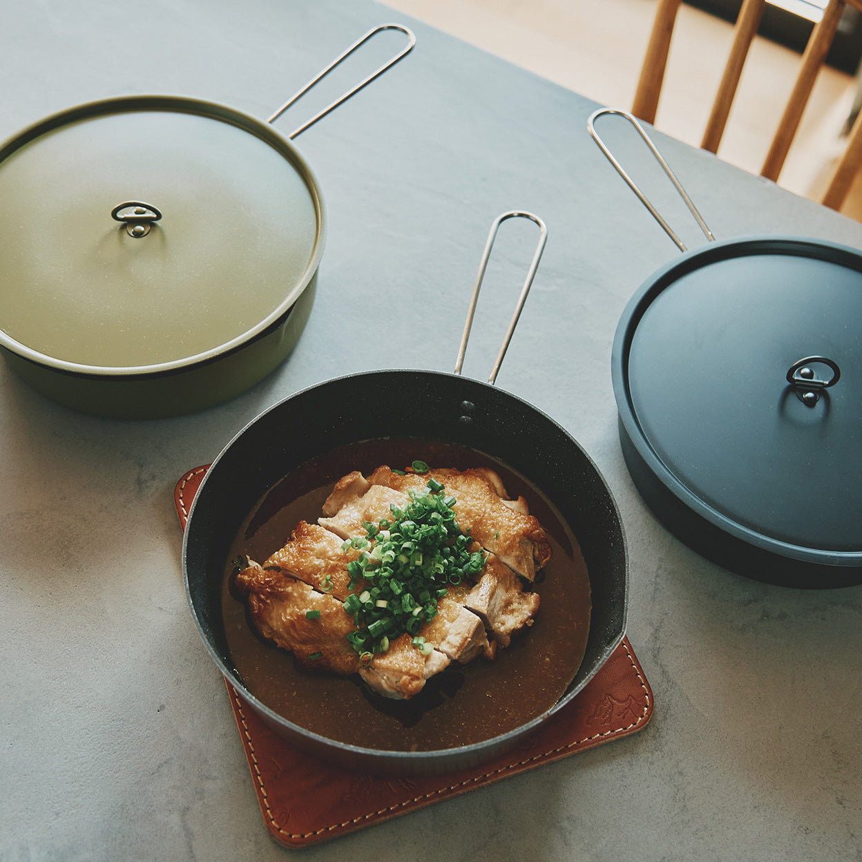 新潟県燕三条の技術を凝縮。ステンレス×アルミ×フッ素の3層構造で、お家のコンロもIHも、ソトで焚き火もOKの最強スタイル。直径約20cm、スタイリッシュなデザインも特徴です。