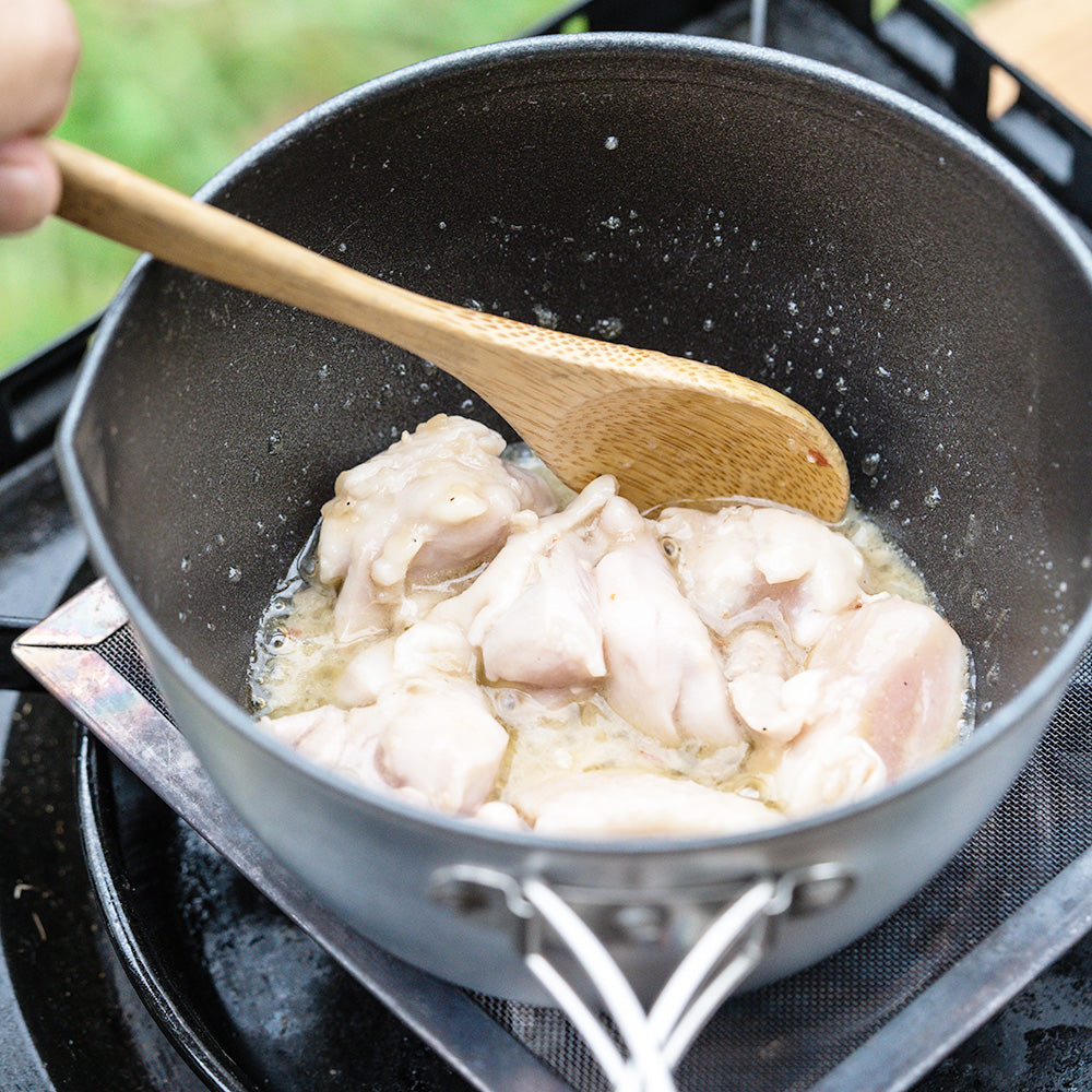 アルミ製で内側にフッ素加工が施されています。焦げつきにくく洗い物が楽ちんです。ただし、フッ素加工の耐熱温度が約260度なので、高温になる揚げ物や焚き火には不向き。