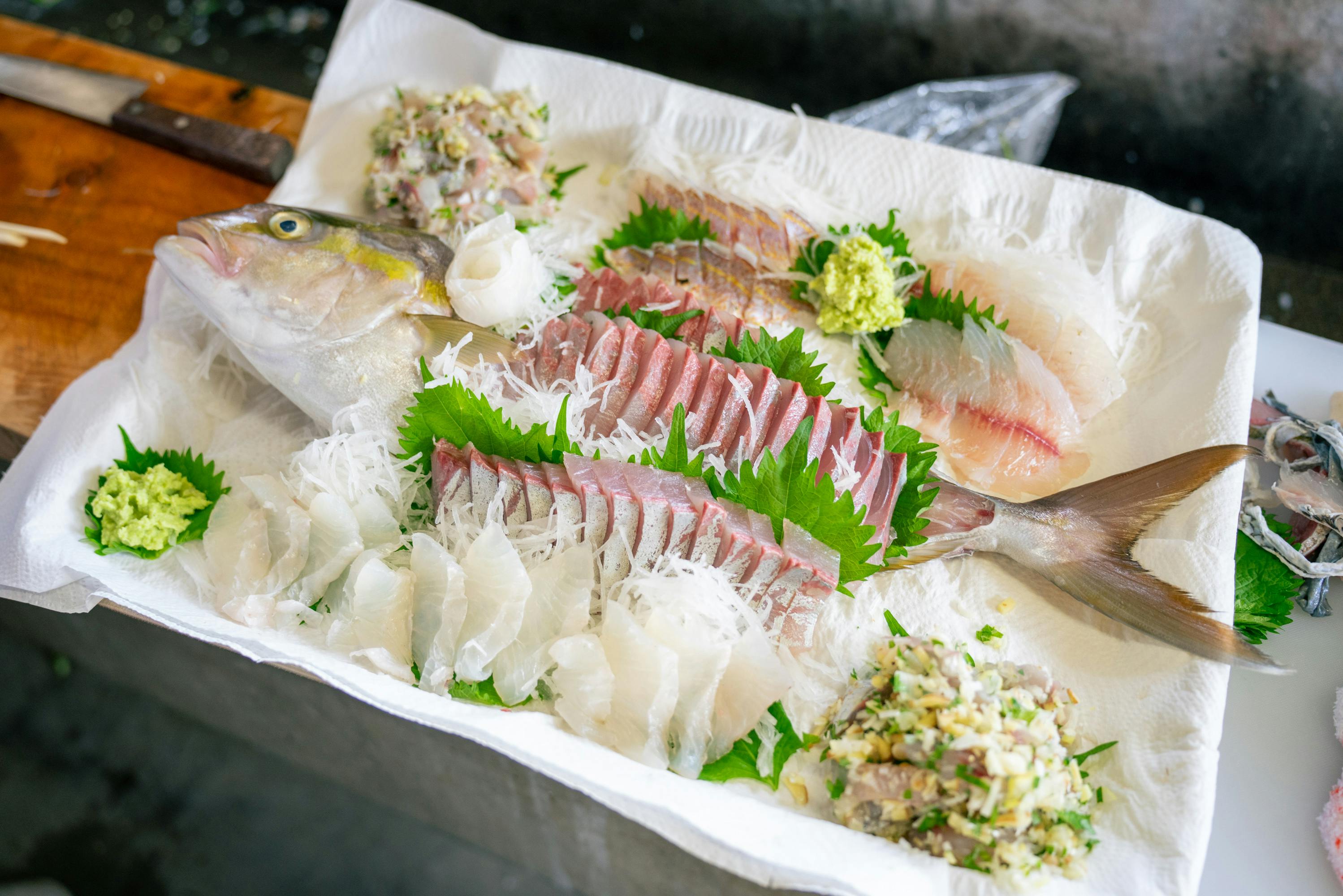 伊豆の美しい自然の中でとれた新鮮な地魚のお刺身、生わさび、手長海老、ズガニ、干物、ジビエなどをご用意します。(詳細は当日までのお楽しみ!)